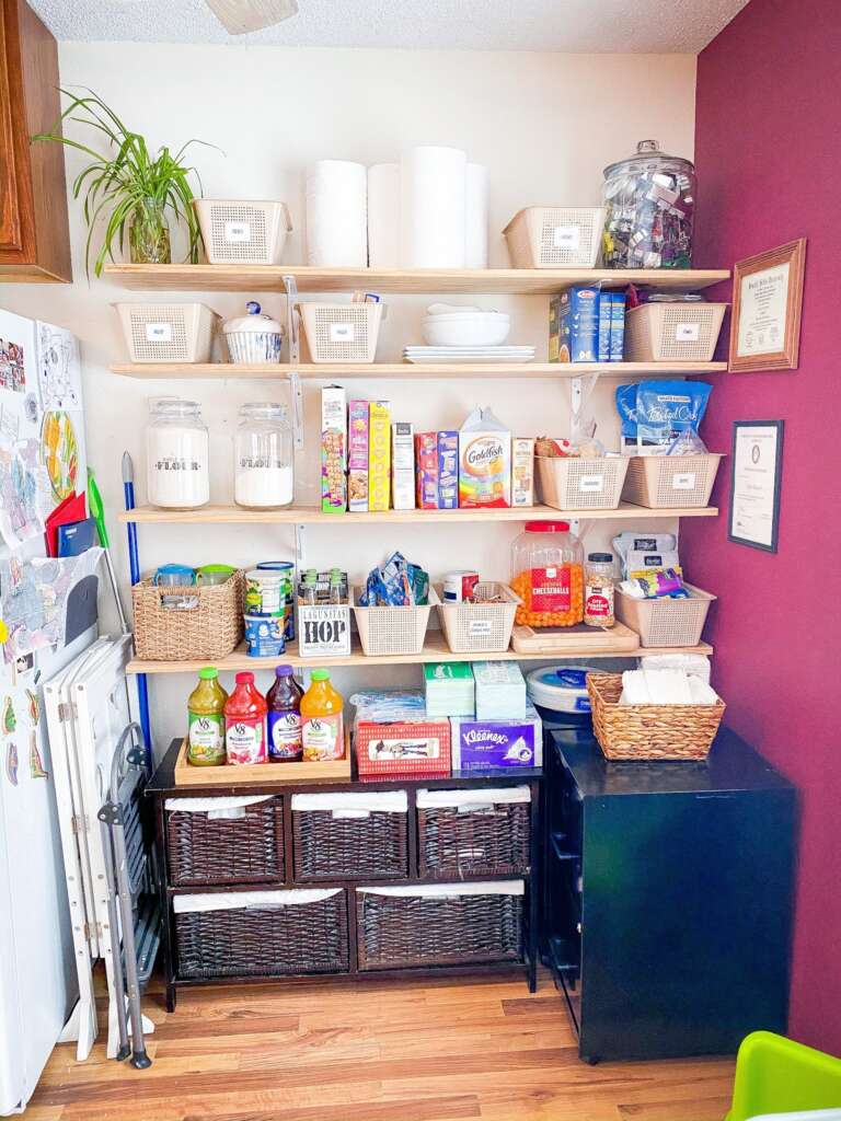 I’m very excited to share that I’ve started organizing my pantry and so far it looks great! I do have some 2019 remnant organizations in the form of inexpensive baskets with labels. BUT, the before here was rough nothing was staying in those designated baskets. Now, I’ve go things re-arranged and organized. This has made it much easier to decide what kind of storage I want to include. I intend on getting rid of all of the boxes in place of cute containers and label them. So, if you’d like to join me on this pantry organization journey. Here’s what you need to do to get to this point: